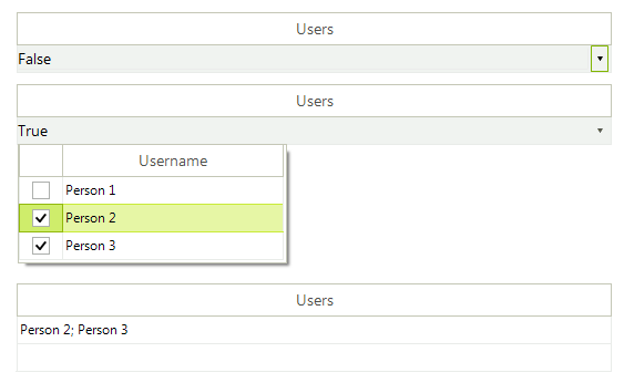 public class PersonChecker : BaseInputEditor{ public override object Value { get { String all = ""; RadMultiColumnComboBoxElement editor = ((RadMultiColumnComboBoxElement)this.EditorElement); foreach (GridViewRowInfo gvri in editor.Rows) { if (Convert.ToBoolean(gvri.Cells[0].Value) == true) { if (all != "") all += "; "; all += Convert.ToString(gvri.Cells[1].Value); } } return all; } set { Console.WriteLine("to do"); } } protected override RadElement CreateEditorElement() { RadMultiColumnComboBoxElement editor = new RadMultiColumnComboBoxElement(); editor.EditorControl.AutoGenerateColumns = false; editor.Columns.Clear(); GridViewCheckBoxColumn check = new GridViewCheckBoxColumn(); check.HeaderText = ""; check.Name = "Check"; check.MinWidth = 40; check.MaxWidth = check.MinWidth; check.ReadOnly = false; editor.Columns.Add(check); GridViewTextBoxColumn username = new GridViewTextBoxColumn(); username.HeaderText = "Username"; username.Name = "Username"; username.MinWidth = 200; editor.Columns.Add(username); editor.Rows.Clear(); editor.Rows.Add(new Object[] { false, "Person 1" }); editor.Rows.Add(new Object[] { false, "Person 2" }); editor.Rows.Add(new Object[] { false, "Person 3" }); //foreach (Person person in FormMain._persons) //{ // editor.Rows.Add( // new Object[] { false, person.SP_Username } // ); //} editor.EditorControl.ShowRowHeaderColumn = false; editor.AutoSizeDropDownToBestFit = true; editor.PopupClosing -= Editor_PopupClosing; editor.PopupClosing += Editor_PopupClosing; editor.EditorControl.CellClick -= EditorControl_CellClick; editor.EditorControl.CellClick += EditorControl_CellClick; return editor; } private void EditorControl_CellClick(object sender, GridViewCellEventArgs e) { if (e.ColumnIndex == 0 && e.RowIndex > -1) { e.Row.Cells[0].Value = !Convert.ToBoolean(e.Row.Cells[0].Value); } } private void Editor_PopupClosing(object sender, RadPopupClosingEventArgs args) { if (args.CloseReason == RadPopupCloseReason.Mouse) { args.Cancel = true; } } public override void BeginEdit() { base.BeginEdit(); this.EditorElement.Focus(); } public override bool EndEdit() { return base.EndEdit(); } public override Type DataType { get { return typeof(string); } }}So basically when user edit cell, another grid (custom editor) will show and user can check few person. After editing value in that cell will be set like Person 1; Person 2; Person 3.