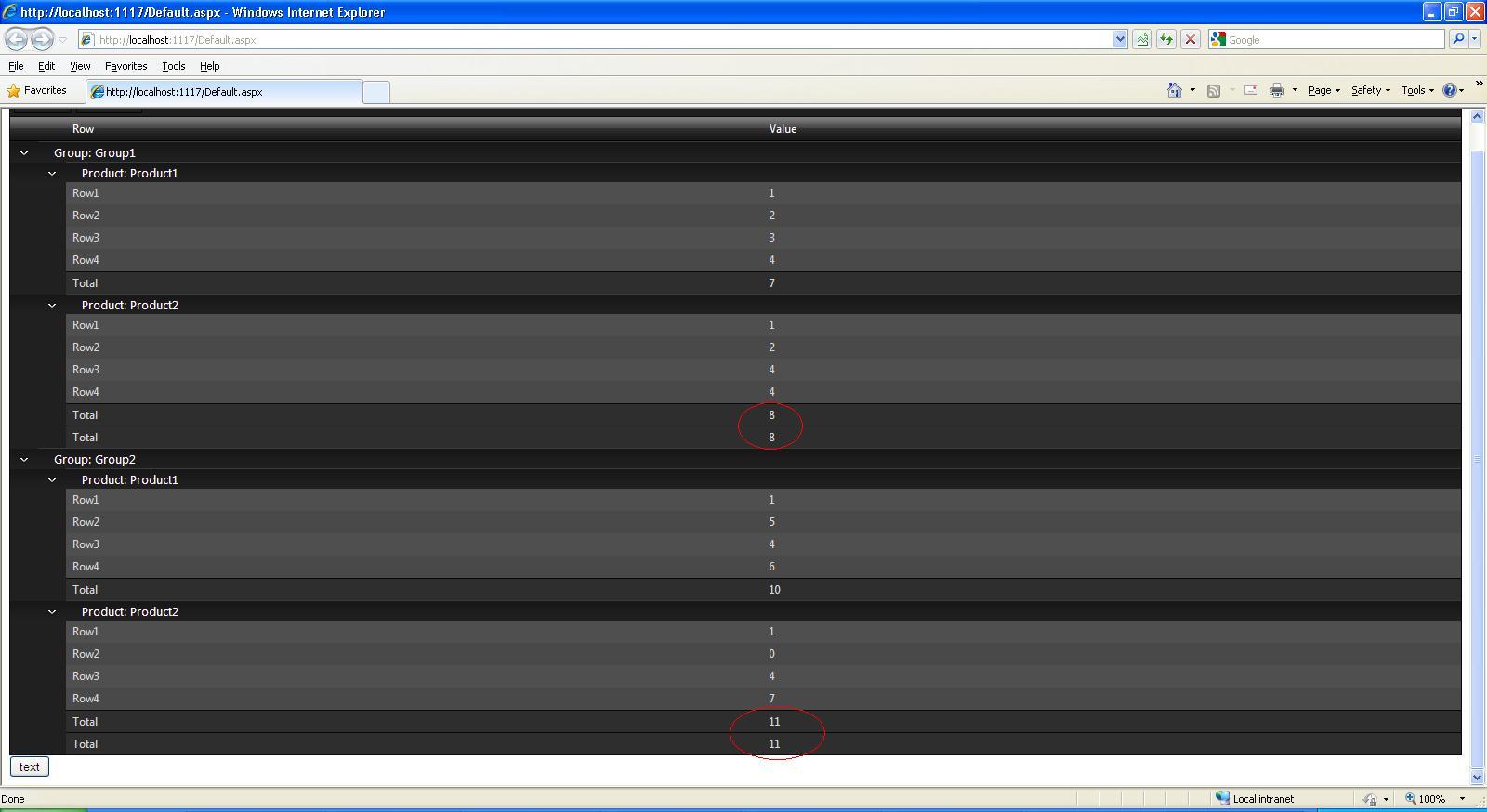 Protected Sub RadGrid1_CustomAggregate(ByVal sender As Object, ByVal e As GridCustomAggregateEventArgs) Handles RadGrid1.CustomAggregate If e.Column.UniqueName = "Row" Then e.Result = "" Else Dim length As Integer = RadGrid1.MasterTableView.GetItems(GridItemType.GroupHeader).Length For i As Integer = 0 To length - 1 Dim total As Double = 0 Dim groupHeader As GridGroupHeaderItem = DirectCast(RadGrid1.MasterTableView.GetItems(GridItemType.GroupHeader)(i), GridGroupHeaderItem) Dim children As GridItem() = groupHeader.GetChildItems() For Each child As GridItem In children If TypeOf child Is GridDataItem Then Dim childItem As GridDataItem = TryCast(child, GridDataItem) Dim rowText As String = childItem.Item("Row").Text If rowText = "Row3" OrElse rowText = "Row4" Then total += childItem.Item("Value").Text End If End If Next e.Result = total Next End If End SubSorry if this is a dumb question, but I'm a little stuck here.