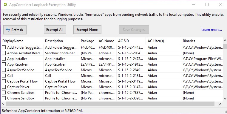 Hello. I am currently looking to hook up a application that is not inside of the AppContainer list. How would one do this? I have attached a screenshot of the AppContrainer Loopback Exemption Utility.