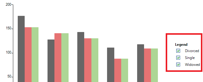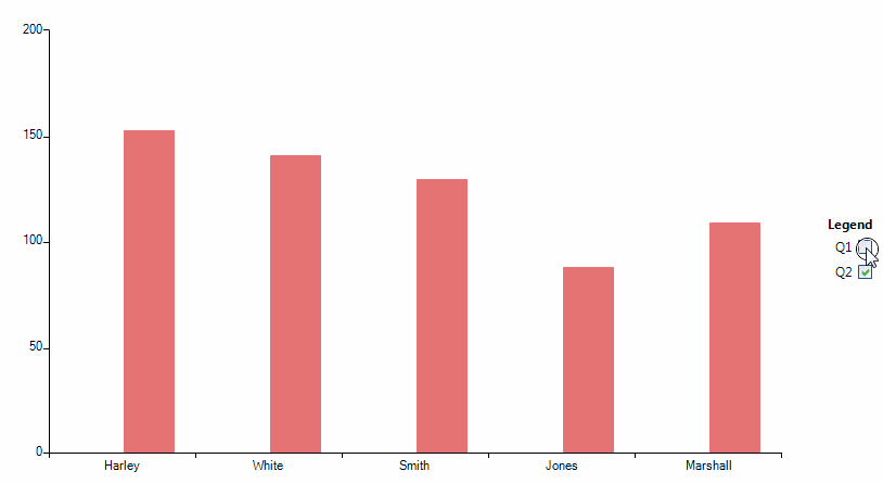 public Form1(){ InitializeComponent(); this.radChartView1.ChartElement.LegendElement.VisualItemCreating += LegendElement_VisualItemCreating; BarSeries barSeries = new BarSeries("Performance", "RepresentativeName"); barSeries.LegendTitle = "Q1"; barSeries.DataPoints.Add(new CategoricalDataPoint(177, "Harley")); barSeries.DataPoints.Add(new CategoricalDataPoint(128, "White")); barSeries.DataPoints.Add(new CategoricalDataPoint(143, "Smith")); barSeries.DataPoints.Add(new CategoricalDataPoint(111, "Jones")); barSeries.DataPoints.Add(new CategoricalDataPoint(118, "Marshall")); this.radChartView1.Series.Add(barSeries); BarSeries barSeries2 = new BarSeries("Performance", "RepresentativeName"); barSeries2.LegendTitle = "Q2"; barSeries2.DataPoints.Add(new CategoricalDataPoint(153, "Harley")); barSeries2.DataPoints.Add(new CategoricalDataPoint(141, "White")); barSeries2.DataPoints.Add(new CategoricalDataPoint(130, "Smith")); barSeries2.DataPoints.Add(new CategoricalDataPoint(88, "Jones")); barSeries2.DataPoints.Add(new CategoricalDataPoint(109, "Marshall")); this.radChartView1.Series.Add(barSeries2); this.radChartView1.ShowLegend = true; this.radChartView1.LegendTitle = "Legend";}private void LegendElement_VisualItemCreating(object sender, LegendItemElementCreatingEventArgs e){ e.ItemElement = new CustomLegendItemElement(e.LegendItem);}public class CustomLegendItemElement : LegendItemElement{ public CustomLegendItemElement(LegendItem item) : base(item) { } RadCheckBoxElement cb = new RadCheckBoxElement(); protected override void CreateChildElements() { base.CreateChildElements(); this.MarkerElement.Visibility = Telerik.WinControls.ElementVisibility.Collapsed; cb.ToggleState = Telerik.WinControls.Enumerations.ToggleState.On; this.Children.Add(cb); cb.ToggleStateChanged += cb_ToggleStateChanged; } private void cb_ToggleStateChanged(object sender, StateChangedEventArgs args) { if (args.ToggleState == Telerik.WinControls.Enumerations.ToggleState.On) { this.LegendItem.Element.IsVisible = true; } else { this.LegendItem.Element.IsVisible = false; } }}I hope this information helps. Should you have further questions I would be glad to help.