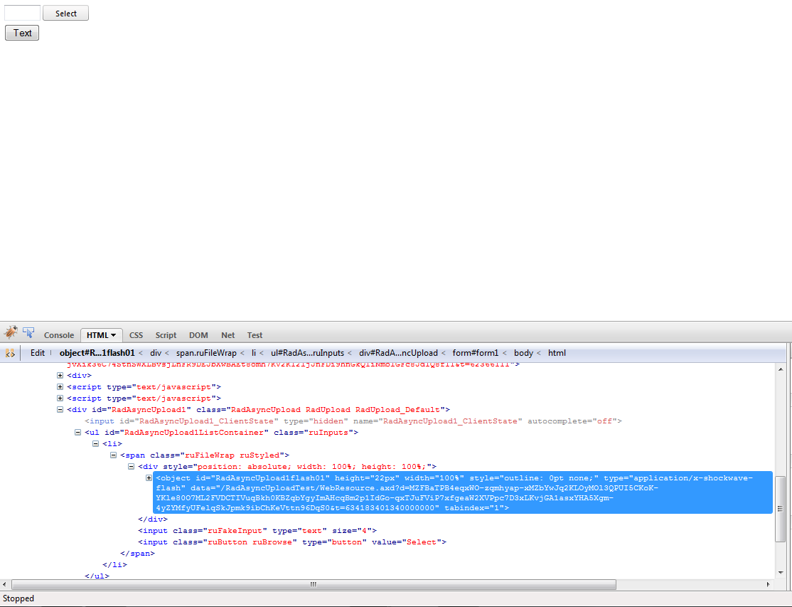<%@ Page Title="" Language="C#" MasterPageFile="~/Views/Shared/Site.Master" Inherits="System.Web.Mvc.ViewPage<dynamic>" %><%@ Register Assembly="Telerik.Web.UI" TagPrefix="telerik" Namespace="Telerik.Web.UI" %><asp:Content ID="Content1" ContentPlaceHolderID="TitleContent" runat="server"> CustomSkin</asp:Content><asp:Content ID="Content3" ContentPlaceHolderID="HeadContent" runat="server"><style type="text/css"> .invisible { opacity:0; position:absolute; filter:alpha(opacity=100); top:0px; left:0px; } </style> <script type="text/javascript"> var uploadsInProgress = 0; function uploading(sender, args) { uploadsInProgress++; $telerik.$(".container").html("uploading"); } function uploaded(sender, args) { uploadsInProgress--; if (!uploadsInProgress) { $telerik.$(".container").html("uploaded"); } } </script></asp:Content><asp:Content ID="Content2" ContentPlaceHolderID="MainContent" runat="server"> <form id="form1" runat="server"> <asp:ScriptManager runat="server" ID="ScriptManager1"></asp:ScriptManager> <h2>Custom Skin</h2> <div> <span class="container"> [Select file] </span> <div class="invisible"> <telerik:RadAsyncUpload runat="server" ID="RadAsyncUpload1" OnClientFileUploading="uploading" OnClientFileUploaded="uploaded"> </telerik:RadAsyncUpload> </div> </div> </form></asp:Content>0