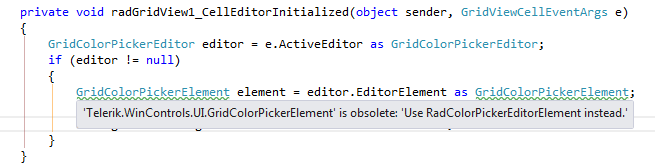 GridColorPickerEditor editor = e.ActiveEditor as GridColorPickerEditor; if (editor != null) { GridColorPickerElement element = editor.EditorElement as GridColorPickerElement; RadColorDialog dialog = element.ColorDialog; dialog.ColorDialogForm.ShowProfessionalColors = false; }In version 2016.1.112 GridColorPickerElement was marked as obsolete and later it was removed: