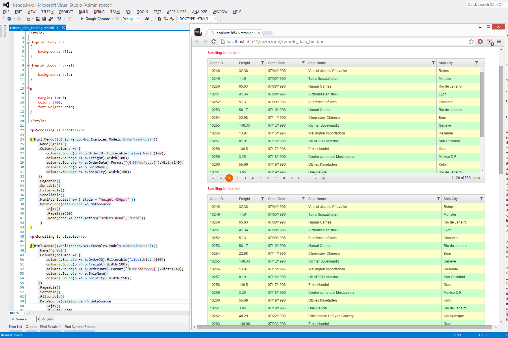 .k-grid tbody > tr{}.k-grid tbody > .k-alt{}Keep in mind that using custom row backgrounds can override the Grid's selected row styles. In this case you will need to re-apply them with a higher CSS specificity.