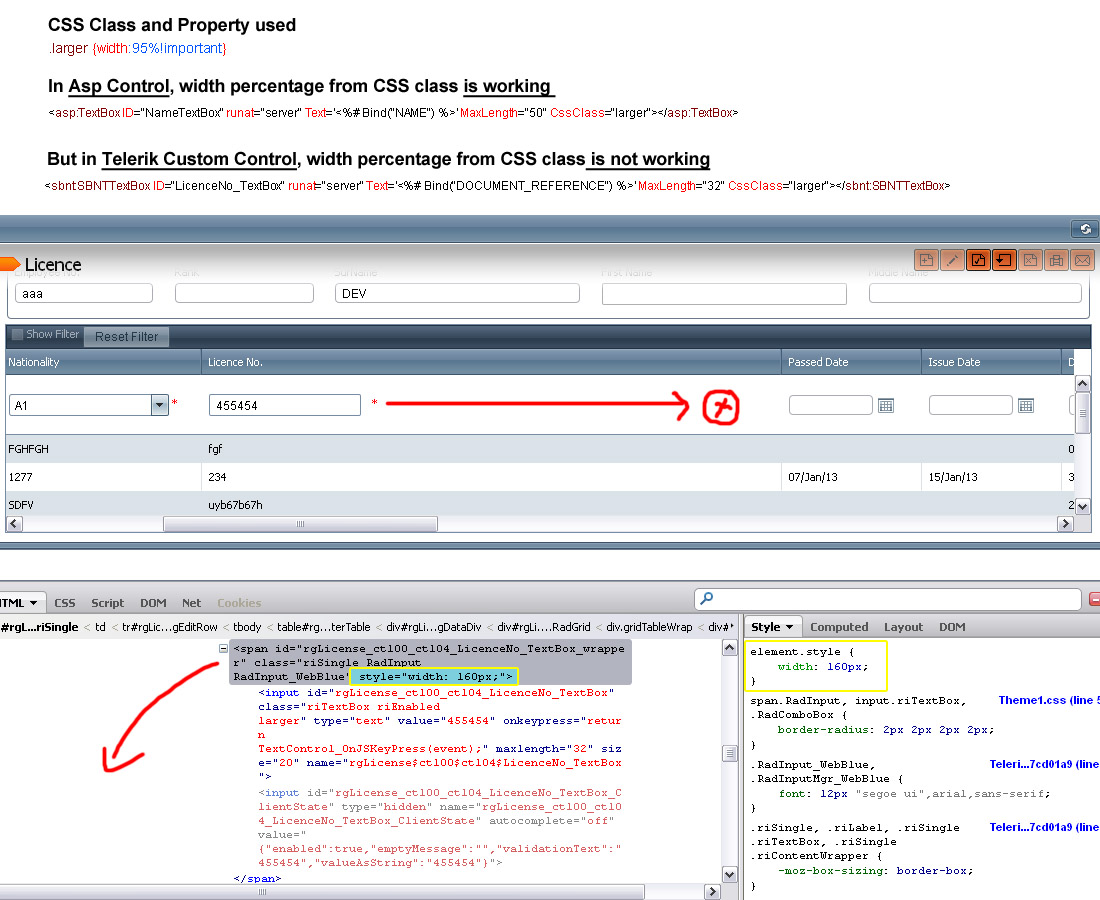 In normal ASP textbox width in percentage from css is working and also we can only an input is rendering. But when we use Telerik Custom control we can see a span is renderin first then inside that span textbox is rendering. So that this span automatically setting 160px width so if we put width:50% the text box will take 50% of this Span ie 80px.