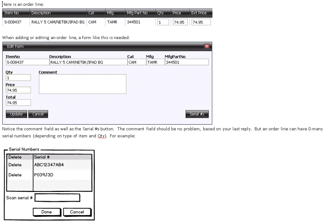 [ { "OrderId":3, "Line":1, "ItemId":"0023", "Description":"Alcaline substrat-234", "Class":"A34", "Manufacturer":"AA123", "PartNo":"12347354", "Qty":2, "ExtCost":12.72, "ExtPrice":19.10, "ExtTax":1.80, "Comment":"Some comment... Could be long...", Serials: [ "AAAA1234", "BBBB2222" ] }, { "OrderId":3, "Line":2, "ItemId":"0056", "Description":"Bee pulsating epox", "Class":"34", "Manufacturer":"ZB83", "PartNo":"52234623", "Qty":1, "ExtCost":252.31, "ExtPrice":290.11, "ExtTax":20.10, "Comment":"Some other comment about this line...", Serials: [ "AAAA1234", "BBBB2222" ] }]In the grid, I only display a few of the fields: