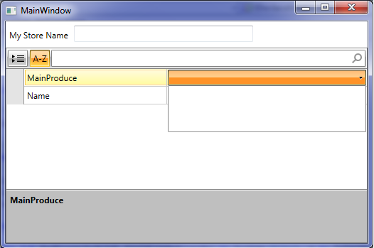 <Window x:Class="MainWindow" xmlns:telerik="http://schemas.telerik.com/2008/xaml/presentation" Title="MainWindow" Height="350" Width="525"> <Grid> <telerik:RadPropertyGrid Margin="0,37,0,0" Name="RadPropertyGrid1" /> <TextBox Height="23" HorizontalAlignment="Left" Margin="96,6,0,0" Name="tStoreName" VerticalAlignment="Top" Width="252" /> <Label Content="My Store Name" Height="28" HorizontalAlignment="Left" Margin="0,6,0,0" Name="Label1" VerticalAlignment="Top" /> </Grid></Window>Imports System.ReflectionImports Telerik.Windows.Controls.Data.PropertyGridClass MainWindow Public MyStore As New GroceryStore Public LimitedProduceList As New List(Of GroceryStore.ProduceTypes) Public Sub New() ' This call is required by the designer. InitializeComponent() ' Add any initialization after the InitializeComponent() call. Me.RadPropertyGrid1.Item = MyStore LimitedProduceList.Add(GroceryStore.ProduceTypes.Dairy) LimitedProduceList.Add(GroceryStore.ProduceTypes.Grains) LimitedProduceList.Add(GroceryStore.ProduceTypes.Vegetables) End Sub Private Sub RadPropertyGrid1_FieldLoaded(sender As System.Object, e As Telerik.Windows.Controls.Data.PropertyGrid.FieldEventArgs) Handles RadPropertyGrid1.FieldLoaded 'warning! You can't update visibilities here. The internal field control cannot handle the refresh until all field loaded events are called. Dim MyRadComboBox As RadComboBox = Nothing Try Dim requiredPropertyDefinition = Me.RadPropertyGrid1.PropertyDefinitions.FirstOrDefault(Function(p) p.DisplayName = "MainProduce") Dim propertyGridField = Me.RadPropertyGrid1.ChildrenOfType(Of PropertyGridField)().FirstOrDefault(Function(t) t.DataContext Is requiredPropertyDefinition) MyRadComboBox = TryCast(propertyGridField.Content, RadComboBox) MyRadComboBox.ItemsSource = LimitedProduceList Catch ex As Exception End Try End SubEnd ClassPublic Class GroceryStore Public Property Name As String Public Property MainProduce As ProduceTypes Public Enum ProduceTypes As Long Fruit Vegetables Meat Dairy Grains End EnumEnd ClassSuch behavior can be observed when combo box cannot display the value from the source. Can you try setting DisplayMemberPath property and verify whether it is visualized properly ?
