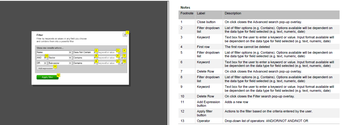 In order to achieve this look for the RadFilter control you should use custom skin. With this custom skin you could position the elements of the control in the arrangement you would like. You could set display:none for the elements of the RadFilter you would like to be hidden. If you would like you could check the typical HTML output of a RadFilter control here. Note that displaying the context menu setting the operand in the expression (Equal to, Contains, etc.) as RadComboBox would be hard to achieve.