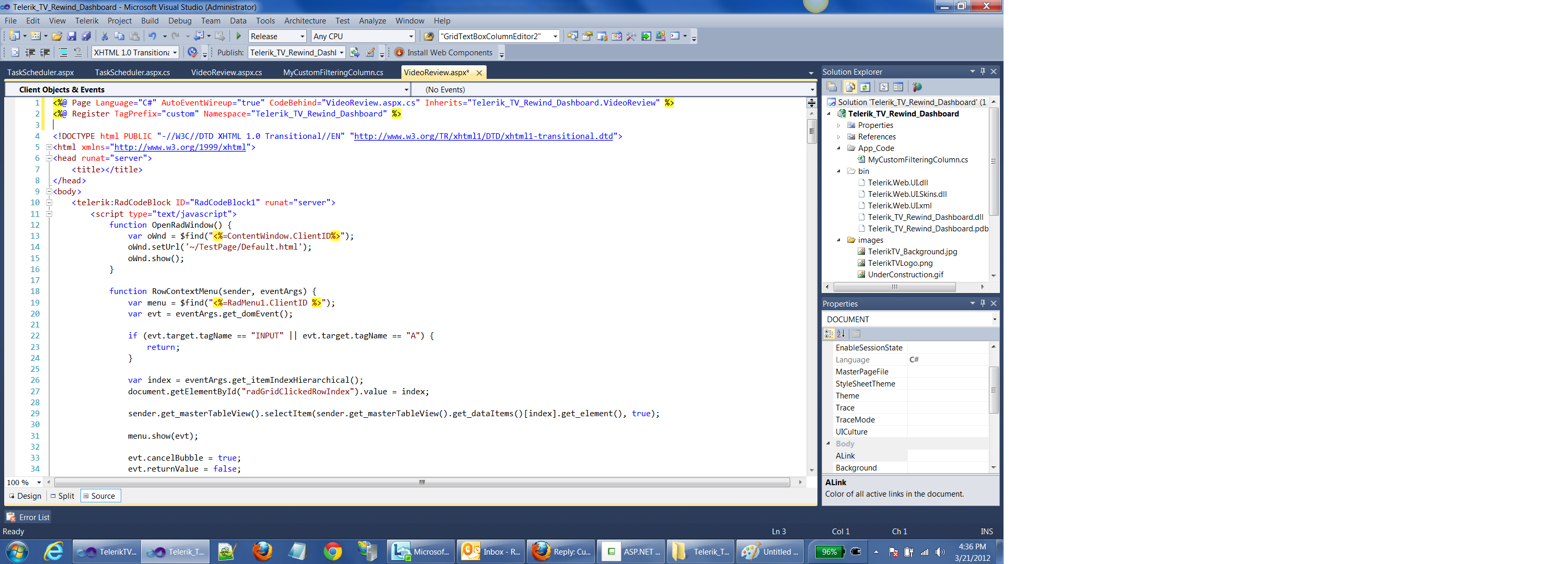 <%@ Page Language="C#" AutoEventWireup="true" CodeBehind="VideoReview.aspx.cs" Inherits="Telerik_TV_Rewind_Dashboard.VideoReview" %><%@ Register TagPrefix="custom" Namespace="Telerik_TV_Rewind_Dashboard" %>....... <%-- This is the Review Status Column--%> <custom:MyCustomFilteringColumn DataField="Status" HeaderText="ReviewStatus" Groupable="true" GroupByExpression="Status Group by Status" SortExpression="Status"> <ItemTemplate> <asp:Label ID="lblStatus" runat="server"><%# Eval("Status") %></asp:Label> </ItemTemplate> <EditItemTemplate> <asp:DropDownList DataMember="Status" ID="dllStatus" runat="server" Width="50px" Text='<%# Bind("Status") %>' SelectedValue='<%# DataBinder.Eval(Container.DataItem, "Status") %>'> <asp:ListItem Value="" Text="-Set Status-" /> <asp:ListItem Value="None" Text="None" /> <asp:ListItem Value="Review" Text="Review" /> <asp:ListItem Value="Deprecate" Text="Deprecate" /> <asp:ListItem Value="Revise" Text="Revise" /> <asp:ListItem Value="Completed" Text="Completed" /> </asp:DropDownList> </EditItemTemplate> </custom:MyCustomFilteringColumn>See the attached image with Visual Studio 2010 Solution Explorer.