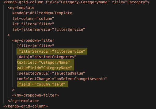 The column filed is also passed to the custom drop-down filter component in order to be used when applying the filter on `categoryChange`.
