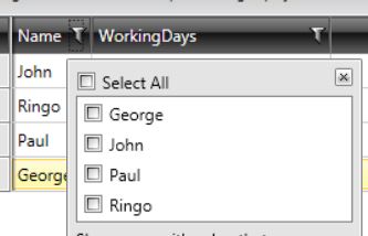 private void OnDistinctValuesLoading(object sender, GridViewDistinctValuesLoadingEventArgs e) { if (e.Column is CollectionPropertyColumn) { e.ItemsSource = new List<string>() { "Monday", "Tuesday", "Wednesday"}; } }Then you need to rework the overridden CreateFilterExpression method of the CollectionPropertyColumnFilterDescriptor. In this lines: