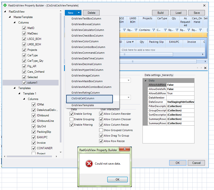 I was able to get it to work and populate, but only by manually editing the designer document of the form in which the grid was located. My column type, however, does appear on my list of column types but after adding it, and when I try closing the grid design window I get an error. Can you tell me what I'm doing wrong? Attached a screen shot showing my columntype in the list, the column added (column1), and the error message I received. Thanks for any help you can give me.