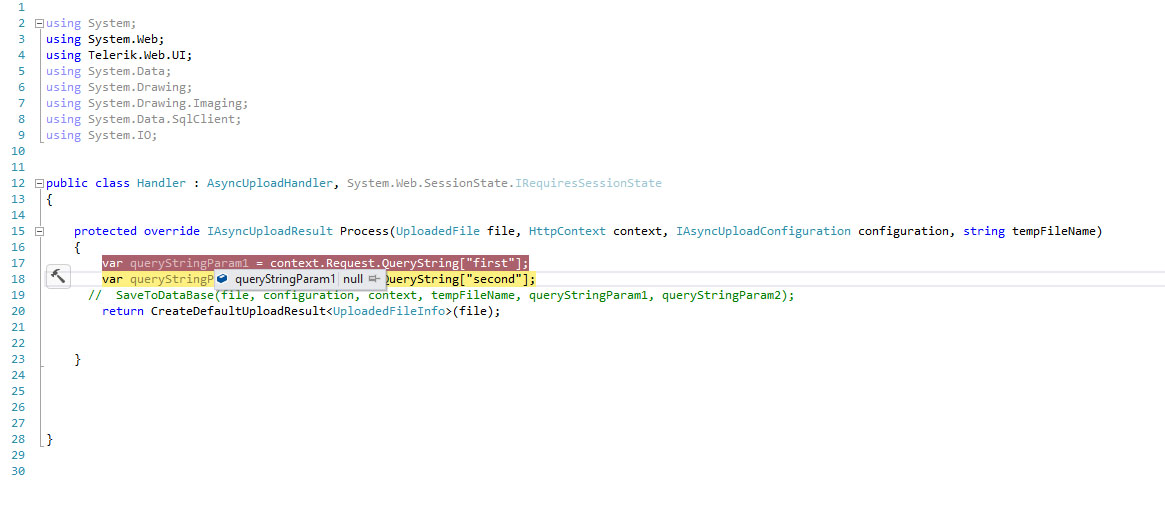 protected override IAsyncUploadResult Process(UploadedFile file, HttpContext context, IAsyncUploadConfiguration configuration, string tempFileName){ try { var CustomerID = context.Request.QueryString["CustomerID"];