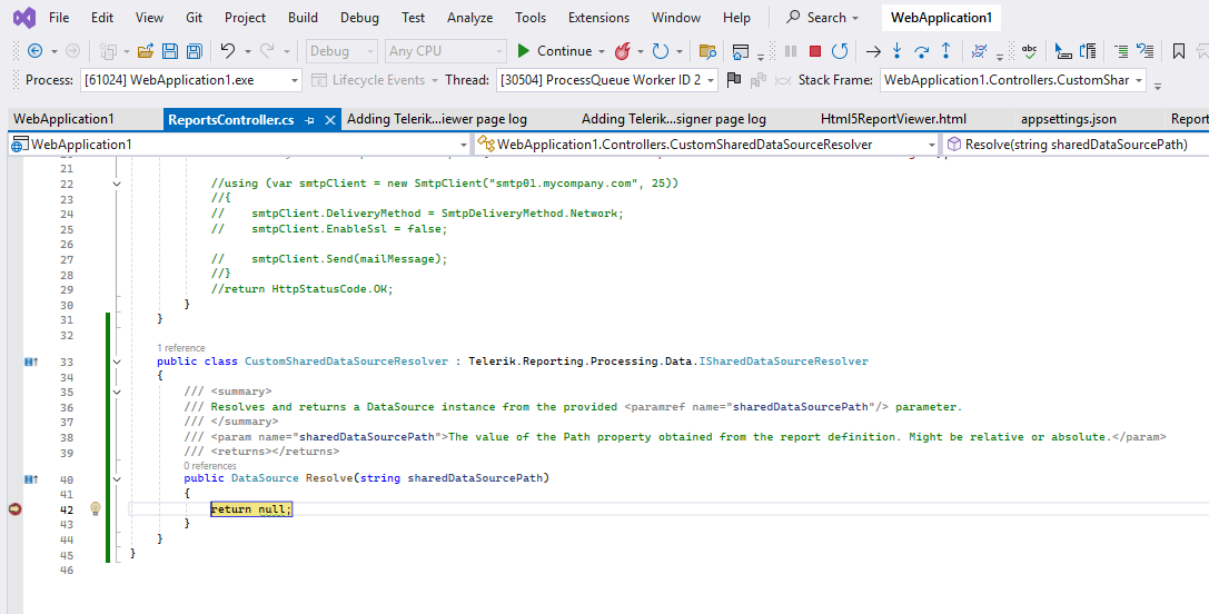 If I put a breakpoint on Resolve(), this breakpoint is hit on version 18.2.24.806 of Telerik.Reporting.Services.AspNetCore and Telerik.WebReportDesigner.Services. But if I upgrade those dependencies to 19.2.25.813 the breakpoint is no longer hit and the previously discussed fix no longer works.