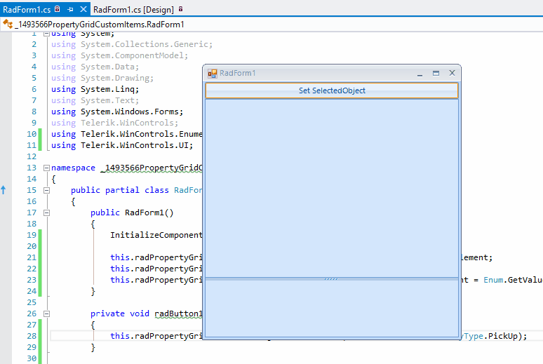 i am trying to follow the official tutorial considering custom items for the RadPropertyGrid (https://docs.telerik.com/devtools/winforms/controls/propertygrid/custom-items) in a Progress Openedge 11.7 environment. I set up a test project consisting of a Form that holds a RadPropertyGrid and a Button whose Click Event will set the SelectedObject of the RadPropertyGrid. All other classes are more or less exactly translated into OpenEdge code from the tutorial.