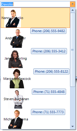 public Form1(){ InitializeComponent(); this.radDropDownList1.CreatingVisualListItem += radDropDownList1_CreatingVisualListItem; this.radDropDownList1.DataSource = this.employeesBindingSource; this.radDropDownList1.DisplayMember = "LastName"; this.radDropDownList1.ValueMember = "EmployeeID"; this.radDropDownList1.AutoSizeItems = true; }private void radDropDownList1_CreatingVisualListItem(object sender, Telerik.WinControls.UI.CreatingVisualListItemEventArgs args){ args.VisualItem = new CustomVisualItem();}public class CustomVisualItem : RadListVisualItem{ StackLayoutElement container; LightVisualElement textElement; RadButtonElement buttonElement; protected override Type ThemeEffectiveType { get { return typeof(RadListVisualItem); } } protected override void CreateChildElements() { base.CreateChildElements(); container = new StackLayoutElement(); textElement = new LightVisualElement(); buttonElement = new RadButtonElement(); buttonElement.MaxSize = new Size(200, 20); buttonElement.Click+=buttonElement_Click; this.Children.Add(container); container.Orientation = Orientation.Horizontal; container.Children.Add(textElement); container.Children.Add(buttonElement); } private void buttonElement_Click(object sender, EventArgs e) { RadMessageBox.Show(this.Data.Value.ToString()); } public override void Synchronize() { base.Synchronize(); this.Text = string.Empty; DataRowView rowView = this.Data.DataBoundItem as DataRowView; if (rowView != null) { this.textElement.Image = GetImageFromData(rowView.Row["Photo"] as byte[]); this.textElement.Text = rowView.Row["FirstName"].ToString() + " " + rowView.Row["LastName"].ToString(); this.buttonElement.Text = "Phone: " + rowView.Row["HomePhone"].ToString(); } } private Image GetImageFromData(byte[] imageData) { const int OleHeaderLength = 78; MemoryStream memoryStream = new MemoryStream(); if (HasOleContainerHeader(imageData)) { memoryStream.Write(imageData, OleHeaderLength, imageData.Length - OleHeaderLength); } else { memoryStream.Write(imageData, 0, imageData.Length); } Bitmap bitmap = new Bitmap(memoryStream); return bitmap.GetThumbnailImage(55, 65, null, new IntPtr()); } private bool HasOleContainerHeader(byte[] imageByteArray) { const byte OleByte0 = 21; const byte OleByte1 = 28; return (imageByteArray[0] == OleByte0) && (imageByteArray[1] == OleByte1); }}I hope this information helps. If you have any additional questions, please let me know.