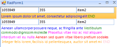 using System;using System.Drawing;using System.Windows.Forms;using Telerik.WinControls.Layouts;using Telerik.WinControls.UI;namespace UCStudio.UI{ public class RuleVisualItem : SimpleListViewVisualItem { private RadTextBoxElement _idElement; private RadTextBoxElement _sequenceElement; private RadTextBoxElement _nameElement; private RadLabelElement _ruleTextElement; private LightVisualElement _contentElement; private StackLayoutPanel _vStackLayout; private StackLayoutPanel _stackLayout; protected override void CreateChildElements() { base.CreateChildElements(); _stackLayout = new StackLayoutPanel { Orientation = Orientation.Horizontal, //AutoSize = true, EqualChildrenWidth = true, ShouldHandleMouseInput = false, NotifyParentOnMouseInput = true }; _vStackLayout = new StackLayoutPanel { Orientation = Orientation.Vertical, ShouldHandleMouseInput = false, NotifyParentOnMouseInput = true }; _contentElement = new LightVisualElement { StretchHorizontally = true, MinSize = new Size(120, 0), ShouldHandleMouseInput = false, NotifyParentOnMouseInput = true }; _idElement = new RadTextBoxElement {Text = ""}; _idElement.TextBoxItem.ReadOnly = true; _stackLayout.Children.Add( _idElement); _sequenceElement = new RadTextBoxElement {Text = ""}; _sequenceElement.TextBoxItem.ReadOnly = true; _stackLayout.Children.Add( _sequenceElement); _nameElement = new RadTextBoxElement {Text = ""}; _nameElement.TextBoxItem.ReadOnly = true; _stackLayout.Children.Add( _nameElement); _stackLayout.Children.Add( _contentElement); _ruleTextElement = new RadLabelElement { Text = "", ShouldHandleMouseInput = false, NotifyParentOnMouseInput = true }; _vStackLayout.Children.Add( _stackLayout); _vStackLayout.Children.Add( _ruleTextElement); Children.Add( _vStackLayout); } protected override void SynchronizeProperties() { base.SynchronizeProperties(); Text = ""; _contentElement.Text = ""; _idElement.Text = Convert.ToString( Data["RuleItemId"]); _sequenceElement.Text = Convert.ToString( Data["Sequence"]); _nameElement.Text = Convert.ToString( Data["Name"]); _ruleTextElement.Text = Convert.ToString( Data["RuleItemText"]); } protected override Type ThemeEffectiveType => typeof(SimpleListViewVisualItem); }}
