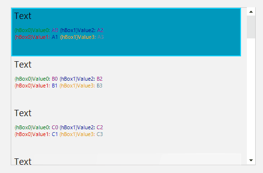 using System;using System.ComponentModel;using System.Drawing;using System.Windows.Forms;using Telerik.WinControls.Layouts;using Telerik.WinControls.UI;namespace TelerikWinFormsApp4{ public partial class RadForm1 : Telerik.WinControls.UI.RadForm { public RadForm1() { InitializeComponent(); this.radListView1.VisualItemCreating += new ListViewVisualItemCreatingEventHandler(this.radListView1_VisualItemCreating); this.radListView1.VisualItemFormatting += new ListViewVisualItemEventHandler(radListView1_VisualItemFormatting); // Populate BullJiveTestListItem with fluff BindingList<BullJiveTestListItem> rows = new BindingList<BullJiveTestListItem>(); for (int alpha = 65; alpha < 85; alpha++) rows.Add(new BullJiveTestListItem(Convert.ToChar(alpha).ToString())); this.Size = new Size(500, 300); radListView1.DataSource = rows; radListView1.ItemSize = new Size(0, 100); radListView1.FullRowSelect = true; } private void radListView1_VisualItemCreating(object sender, ListViewVisualItemCreatingEventArgs e) { if (radListView1.ViewType == ListViewType.ListView) { e.VisualItem = new RowVisualItem(); } } private void radListView1_VisualItemFormatting(object sender, ListViewVisualItemEventArgs e) { if (radListView1.ViewType == ListViewType.ListView) { //BullJiveTestListItem v = (BullJiveTestListItem)e.VisualItem.Data.Value; //???? } } } public class RowVisualItem : SimpleListViewVisualItem { private LightVisualElement hBox0, hBox1; private StackLayoutPanel horizontalLayout; private Point newSize = new Point(0, 100); protected override void CreateChildElements() { base.CreateChildElements(); horizontalLayout = new StackLayoutPanel(); horizontalLayout.Orientation = Orientation.Horizontal; hBox0 = new LightVisualElement(); hBox0.MinSize = new Size(newSize); horizontalLayout.Children.Add(hBox0); hBox1 = new LightVisualElement(); hBox1.MinSize = new Size(newSize); horizontalLayout.Children.Add(hBox1); Children.Add(horizontalLayout); } protected override void SynchronizeProperties() { base.SynchronizeProperties(); if (this.FindAncestor<RadListViewElement>() == null) return; this.Text = "<html><span style=\"color:black;font-size:14.5pt;\">Text</span>"; hBox0.Size = new Size(newSize); hBox0.Text = "<html><span style=\"color:green;\">(hBox0)Value0: </span><span style=\"color:DarkMagenta;\">" + this.Data["Value0"] + "</span>" + "<br><span style=\"color:red;\">(hBox0)Value1: </span><span style=\"color:blue;\">" + this.Data["Value1"] + "</span>"; hBox1.Size = new Size(newSize); hBox1.Text = "<html><span style=\"color:darkblue;\">(hBox1)Value2: </span><span style=\"color:purple;\">" + this.Data["Value2"] + "</span>" + "<br><span style=\"color:orange;\">(hBox1)Value3: </span><span style=\"color:gray;\">" + this.Data["Value3"] + "</span>"; TextAlignment = ContentAlignment.TopLeft; } protected override Type ThemeEffectiveType { get { return typeof(SimpleListViewVisualItem); } } } public class BullJiveTestListItem { public BullJiveTestListItem(string s) { Value0 = s + "0"; Value1 = s + "1"; Value2 = s + "2"; Value3 = s + "3"; } public string Value0 { get; set; } public string Value1 { get; set; } public string Value2 { get; set; } public string Value3 { get; set; } }}