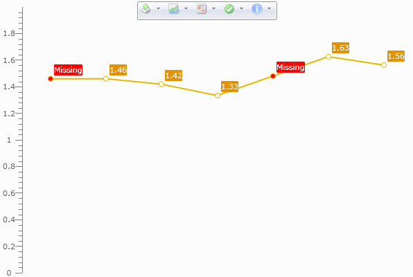 1) Styles define in XAML for the null data point marks and their associated labels. The converters used simply convert the boolean value IsNull, a property on my bound data item, to the true/false brush value defined by the converter and this is ued to colour the point marks/labels background: