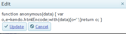 <div data-role="draggable" style="padding-top: 46.2334px; display: block; top: 962.617px; left: 305.5px; z-index: 10007; opacity: 1; transform: scale(1);" class="k-widget k-window"><div style="margin-top: -46.2334px;" class="k-window-titlebar k-header"> <span class="k-window-title">Edit</span><div class="k-window-actions k-header"><a href="#" class="k-window-action k-link"><span class="k-icon k-i-close">Close</span></a></div></div><div style="min-width: 90px; min-height: 50px; overflow: auto;" class="k-window-content k-content" data-role="window" data-uid="18d8287b-f8a9-4dc8-abf4-f0dc7400fcae"><div class="k-edit-form-container">function anonymous(data) {var o,e=kendo.htmlEncode;with(data){o=' <table id="teamEditor"> <colgroup> <col width="160"> <col width="100"> <col> </colgroup> <tbody><tr> <td rowspan="12"><img class="teamImage" data-src="/Content/images/anonymousUser.jpg" src="'; if(empUserName === " null")="" {="" ;o+="/Content/images/anonymousUser.jpg" ;="" }="" else="" +(="" empusername="" )+'.jpg';="" empid="" )+'<="" td="" height="128" width="128"> </td></tr> <tr> <td><div class="k-edit-label"> <label for="teamFirstName">First Name:</label> </div></td> <!--<td>'+( empFirstName )+'</td>--> <td><input id="teamFirstName" class="k-input k-textbox" data-bind="value:empFirstName" type="text"></td> </tr> <tr> <td><div class="k-edit-label"> <label for="teamLastName">Last Name:</label> </div></td> <!--<td>'+( empLastName )+'</td>--> <td><input id="teamLastName" class="k-input k-textbox" data-bind="value:empLastName" type="text"></td> </tr> <tr> <td><div class="k-edit-label"> <label for="teamRole">Role:</label> </div></td> <td><span class="k-widget k-dropdown k-header k-input k-textbox" unselectable="on" style="" tabindex="0"><input style="display: none;" id="teamRole" class="k-input k-textbox k-state-default" data-bind="value:empRole" data-value-field="empRole" data-text-field="empRole" data-source="empRoleDropDownDataSource" data-role="dropdownlist" type="text"></span></td> </tr> <tr> <td><div class="k-edit-label"> <label for="teamCore">Core Member:</label> </div></td> <td><input value="false" id="teamCore" class="k-input k-checkbox" data-bind="value:isCore" type="checkbox"></td> </tr> <tr> <td><div class="k-edit-label"> <label for="teamActive">Active Employee:</label> </div></td> <td><input id="teamActive" disabled="" ';="" if(empstatus="" !="=" "t")="" {="" ;o+="checked="checked"" ;="" }="" +(="" hours="" )+'<="" td=""> </td></tr> </tbody></table> ';}return o;}<a class="k-button k-button-icontext k-grid-update" href="#"><span class="k-icon k-update"></span>Update</a><a class="k-button k-button-icontext k-grid-cancel" href="#"><span class="k-icon k-cancel"></span>Cancel</a></div></div></div>When I deobfuscate the kendo.all.min.js file and poke around looking for a solution, I find this little bit of code within the "var C = B.extend" code block: