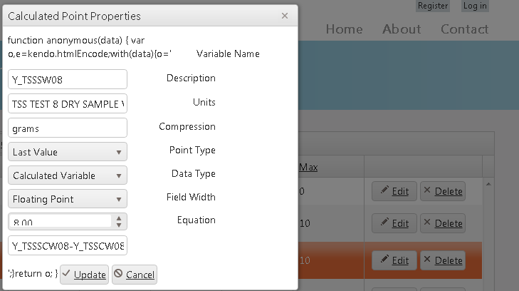 <div class="k-edit-form-container">function anonymous(data) {var o,e=kendo.htmlEncode;with(data){o=' <div class="k-edit-label"> <label for="IndexName">Variable Name</label> </div> <input type="text" class="k-input k-textbox" name="IndexName" data-bind="value:IndexName"> <div class="k-edit-label"> <label for="Description">Description</label> </div> <input type="text" class="k-input k-textbox" name="Description" data-bind="value:Description"> <div class="k-edit-label"> <label for="Units">Units</label> </div> <input type="text" class="k-input k-textbox" name="Units" data-bind="value:Units"> <div class="k-edit-label"> <label for="CompressionType">Compression</label> </div> <!-- drop down list editor for field: "CompressionType" --> <span tabindex="0" style="" unselectable="on" class="k-widget k-dropdown k-header"><span unselectable="on" class="k-dropdown-wrap k-state-default"><span unselectable="on" class="k-input">Last Value</span><span class="k-select"><span class="k-icon k-i-arrow-s">select</span></span></span><input name="CompressionType" data-bind="value:CompressionType" data-value-field="value" data-text-field="description" data-source="compressionTypeDataSource" data-role="dropdownlist" style="display: none; "></span> <div class="k-edit-label"> <label for="PointType">Point Type</label> </div> <!-- drop down list editor for field: "PointType" --> <span tabindex="0" style="" unselectable="on" class="k-widget k-dropdown k-header"><span unselectable="on" class="k-dropdown-wrap k-state-default"><span unselectable="on" class="k-input">Calculated Variable</span><span class="k-select"><span class="k-icon k-i-arrow-s">select</span></span></span><input name="PointType" data-bind="value:PointType" data-value-field="value" data-text-field="description" data-source="pointTypeDataSource" data-role="dropdownlist" style="display: none; "></span> <div class="k-edit-label"> <label for="DataType">Data Type</label> </div> <!-- drop down list editor for field: "DataType" --> <span tabindex="0" style="" unselectable="on" class="k-widget k-dropdown k-header"><span unselectable="on" class="k-dropdown-wrap k-state-default"><span unselectable="on" class="k-input">Floating Point</span><span class="k-select"><span class="k-icon k-i-arrow-s">select</span></span></span><input name="DataType" data-bind="value:DataType" data-value-field="value" data-text-field="description" data-source="dataTypeDataSource" data-role="dropdownlist" style="display: none; "></span> <div class="k-edit-label"> <label for="FieldWidth">Field Width</label> </div> <span style="" class="k-widget k-numerictextbox"><span class="k-numeric-wrap k-state-default"><input class="k-formatted-value k-input k-textbox" type="text" style="display: inline-block; " readonly="readonly"><input type="text" class="k-input k-textbox" name="FieldWidth" data-bind="value:FieldWidth" data-role="numerictextbox" style="display: none; "><span class="k-select"><span unselectable="on" class="k-link"><span unselectable="on" class="k-icon k-i-arrow-n" title="Increase value">Increase value</span></span><span unselectable="on" class="k-link"><span unselectable="on" class="k-icon k-i-arrow-s" title="Decrease value">Decrease value</span></span></span></span></span> <div class="k-edit-label" id="equationLabel"> <label for="Equation" style="">Equation</label> </div> <input type="text" class="k-input k-textbox" id="equationTextBox" name="Equation" data-bind="value:Equation" style=""> <p></p> ';}return o;}<a class="k-button k-button-icontext k-grid-update" href="#"><span class="k-icon k-update"></span>Update</a><a class="k-button k-button-icontext k-grid-cancel" href="#"><span class="k-icon k-cancel"></span>Cancel</a></div>