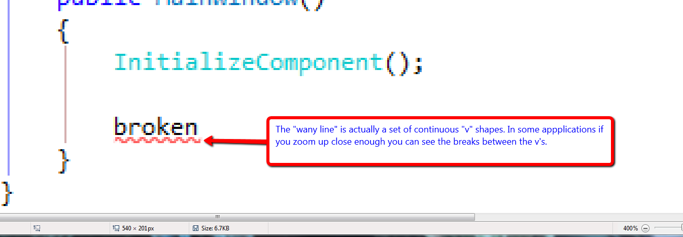 Rectangle rectangle = new Rectangle();rectangle.Width = Math.Max(0, (endInline.BoundingRectangle.Location.X - startInline.BoundingRectangle.Location.X));rectangle.Height = startInline.LineInfo.Height;Canvas.SetTop(rectangle, startInline.ControlBoundingRectangle.Top - (startInline.LineInfo.Height / 1.5));Canvas.SetLeft(rectangle, startInline.BoundingRectangle.Left);rectangle.Fill = FillBrush;rectangle.Opacity = MouseOverHighlightLayer.MouseOutOpacity;rectangle.MouseEnter += (s, e) => { ((Rectangle)s).Opacity = MouseOverHighlightLayer.MouseInOpacity; };rectangle.MouseLeave += (s, e) => { ((Rectangle)s).Opacity = MouseOverHighlightLayer.MouseOutOpacity; };I'm mainly looking for the best way to draw a red wavy line.