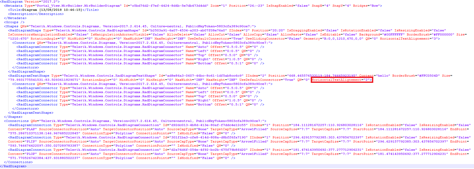 The problem is that I want to save the HorizontalAlignement of the text in my custom RadDiagramConnection, and I don't know how I can do this.