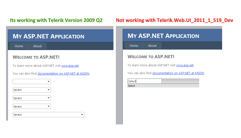 We tried with two version i.e Telerik 2009 Q2 and Telerik.Web.UI_2011_1_519_Dev, But its only working with 2009 Q2 Version.. I'm attaching screenshot by applying changes with above two versions.