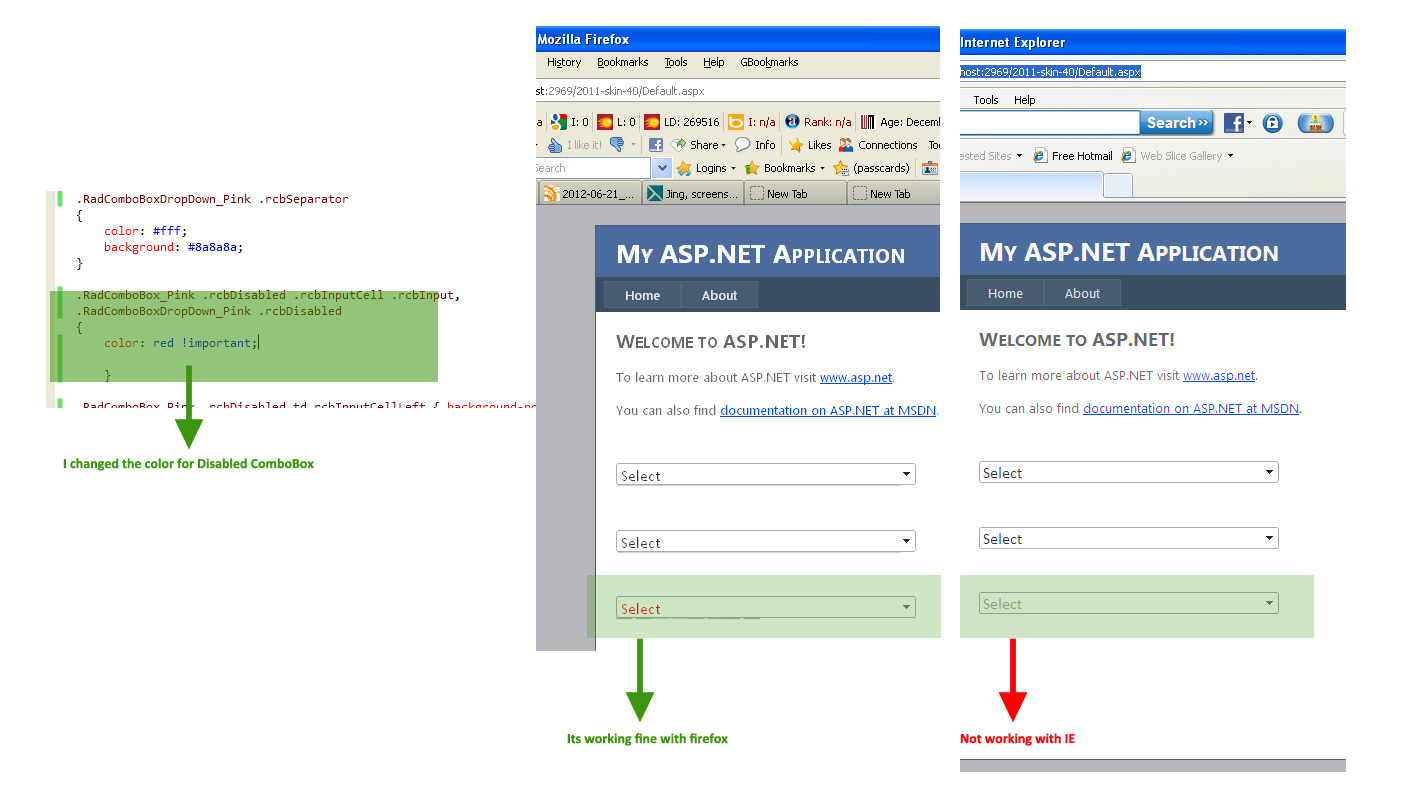 The issue is: I have to change the text color for disabled ComboBox and i changed in stylesheet, But its only working in firefox not in Internet Explorer, As IE is the main browser for our client. I have attached detailed screenshot please have a look and let me know how i can fix this issue.