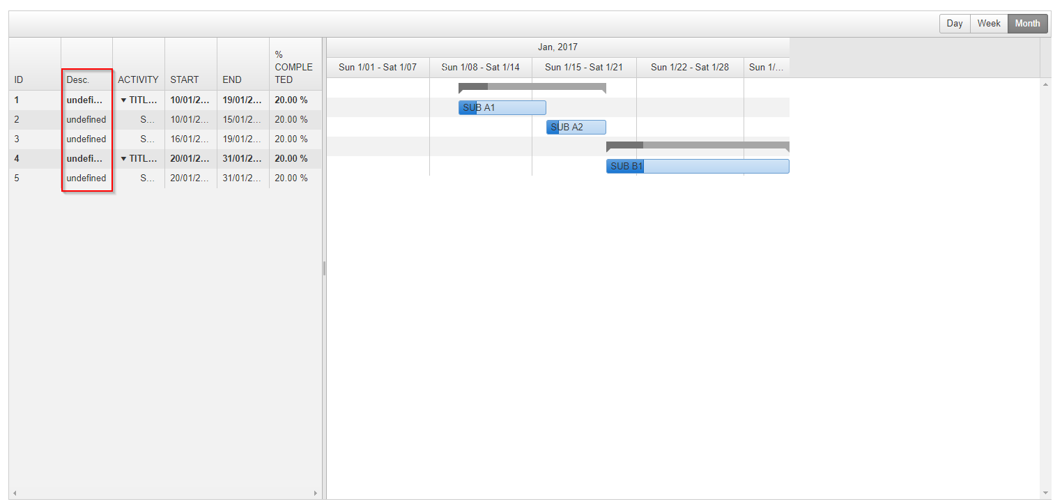 <telerik:RadGantt runat="server" ID="RadGantt1" Enabled="true" ReadOnly="True" AllowSorting="False" AutoGenerateColumns="false"> <DataBindings> <TasksDataBindings IdField="ID" TitleField="Title" StartField="Start" EndField="End" PercentCompleteField="PercentComplete" OrderIdField="OrderID" SummaryField="Summary" ParentIdField="ParentID" /> </DataBindings> <CustomTaskFields> <telerik:GanttCustomField PropertyName="Description" ClientPropertyName="description" Type="String"/> </CustomTaskFields> <Columns> <telerik:GanttBoundColumn DataField="ID" HeaderText="ID" AllowEdit="false" AllowSorting="false"></telerik:GanttBoundColumn> <telerik:GanttBoundColumn DataField="Description" HeaderText="Desc." DataType="String" UniqueName="Description"></telerik:GanttBoundColumn> <telerik:GanttBoundColumn DataField="Title" HeaderText="ACTIVITY" AllowEdit="false" AllowSorting="false"></telerik:GanttBoundColumn> <telerik:GanttBoundColumn DataField="Start" HeaderText="START" DataFormatString="dd/MM/yyyy" AllowEdit="false" AllowSorting="false"></telerik:GanttBoundColumn> <telerik:GanttBoundColumn DataField="End" HeaderText="END" DataFormatString="dd/MM/yyyy" AllowEdit="false" AllowSorting="false"></telerik:GanttBoundColumn> <telerik:GanttBoundColumn DataField="PercentComplete" HeaderText="% COMPLETED" AllowEdit="false" AllowSorting="false"></telerik:GanttBoundColumn> </Columns></telerik:RadGantt>