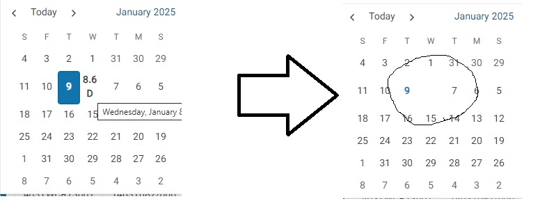 If you need to replace a specific date number with another, you can still achieve this by using CSS to hide the cell’s original content. Below is an enhanced version of the example I shared earlier, now updated to include cell value replacement functionality. Depending on your business requirements, you can use this as a starting point, adding more conditions to the OnCellRender handler and further customizations as needed.