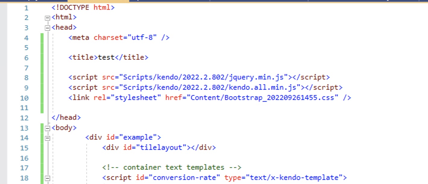 As code I copied the code from the tile layout example (https://demos.telerik.com/kendo-ui/tilelayout/index?_ga=2.175878118.554134959.1665135807-2026844688.1664867263&_gl=1*1inatwj*_ga*MjAyNjg0NDY4OC4xNjY0ODY3MjYz*_ga_9JSNBCSF54*MTY2NTE0Mjk5MS4yLjEuMTY2NTE0NDE5MS4wLjAuMA..) and adapted the linked script-sources to my paths.