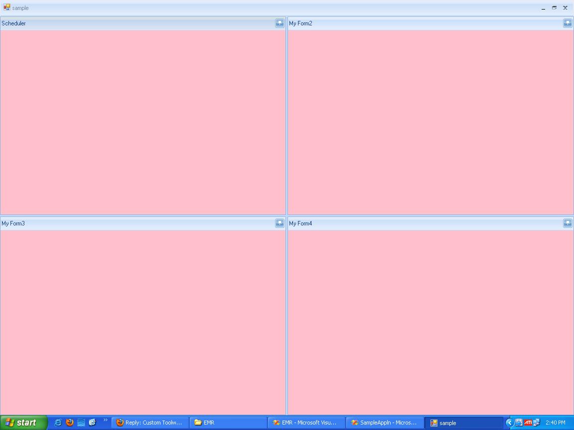 using System;using System.Collections.Generic;using System.ComponentModel;using System.Data;using System.Drawing;using System.Text;using System.Windows.Forms;using Telerik.WinControls;using Telerik.WinControls.UI;using Telerik.WinControls.UI.Docking;using System.IO;namespace SampleAppln{ public partial class Sample : Telerik.WinControls.UI.RadForm { EventHandler han; RadForm frm1;// = new Form(); RadForm frm2;// = new Form(); RadForm frm3;// = new Form(); RadForm frm4;// = new Form(); public Sample() { InitializeComponent(); //frm1 = new SchedulerForm(); //frm2 = new frmPatientsMaster(); //frm3 = new frmPatientsMaster(); //frm4 = new SchedulerForm(); //this.radDock1.AutoDetectMdiChildren = true; //this.radDock1.MdiChildrenDockType = Telerik.WinControls.UI.Docking.DockType.ToolWindow; } private void sample_Load(object sender, EventArgs e) { han = new EventHandler(sample_Resize); listBox1.Items.Add("Load"); //frm1.Resize += han; //frm2.Resize += han; //frm3.Resize += han; //frm4.Resize += han; this.radDock1.MainDocumentContainerVisible = false; frm1 = new RadForm(); frm2 = new RadForm(); frm3 = new RadForm(); frm4 = new RadForm(); frm1.BackColor = Color.Pink; frm1.Text = "Scheduler"; frm1.Select(); HostWindow window = this.radDock1.DockControl(frm1, DockPosition.Top); window.ToolCaptionButtons = ToolStripCaptionButtons.AutoHide; frm2.BackColor = Color.Pink; frm2.Text = "My Form2"; frm2.Select(); this.radDock1.DockControl(frm2, window, DockPosition.Right).ToolCaptionButtons = ToolStripCaptionButtons.AutoHide; frm3.BackColor = Color.Pink; frm3.Text = "My Form3"; frm3.Select(); window = this.radDock1.DockControl(frm3, DockPosition.Bottom); window.ToolCaptionButtons = ToolStripCaptionButtons.AutoHide; frm4.BackColor = Color.Pink; frm4.Text = "My Form4"; frm4.Select(); this.radDock1.DockControl(frm4, window, DockPosition.Right).ToolCaptionButtons = ToolStripCaptionButtons.AutoHide; frm1.Resize += han; frm2.Resize += han; frm3.Resize += han; frm4.Resize += han; } private void radDock1_DockWindowClosed(object sender, DockWindowEventArgs e) { listBox1.Items.Add("Closed " + e.DockWindow.Text + " " + e.DockWindow.DockType.ToString()); if (e.DockWindow.DockType == DockType.ToolWindow) return; DockWindowEventHandler handler = new DockWindowEventHandler(radDock1_DockWindowClosed); radDock1.DockWindowClosed -= handler; radDock1.RemoveAllWindows(DockWindowCloseAction.CloseAndDispose); sample_Load(sender, e); //radDock1.DockWindowClosed += handler; } private void sample_Resize(object sender, EventArgs e) { RadForm frm = (RadForm)sender; if (frm.Text != "sample") { foreach (HostWindow hw in radDock1.DockWindows) { if (hw.DockState == DockState.Floating) { listBox1.Items.Add("Resize " + hw.Text + " " + hw.DockState.ToString()); DockWindowEventHandler handler = new DockWindowEventHandler(radDock1_DockWindowClosed); radDock1.DockWindowClosed -= handler; frm1.Resize -= han; frm2.Resize -= han; frm3.Resize -= han; frm4.Resize -= han; this.radDock1.MainDocumentContainerVisible = true; radDock1.RemoveAllWindows(); radDock1.DockControl(frm1, DockPosition.Fill, DockType.Document); radDock1.DockControl(frm2, DockPosition.Fill, DockType.Document); radDock1.DockControl(frm3, DockPosition.Fill, DockType.Document); radDock1.DockControl(frm4, DockPosition.Fill, DockType.Document); radDock1.ActivateWindow(hw); radDock1.DockWindowClosed += handler; return; } } } } private void button1_Click(object sender, EventArgs e) { listBox1.Items.Clear(); } }}All the best,