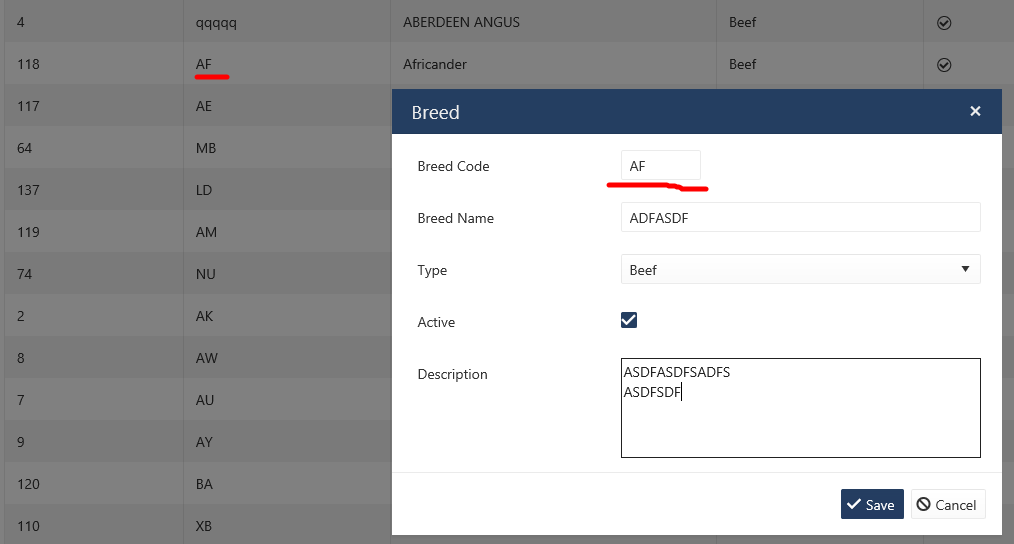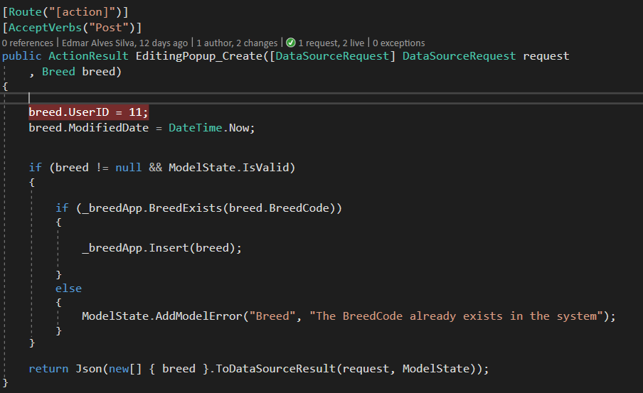 @(Html.Kendo().Grid<Site.Models.BreedViewModel>() .Name("grid") .Columns(columns => { columns.Bound(b => b.BreedId).Title("ID") .Filterable(ftb => ftb.Cell(cell => cell.ShowOperators(true))).Width(120); columns.Bound(b => b.BreedCode).Width(140).Title("Code"); columns.Bound(b => b.BreedName).Width(220).Title("Name"); columns.Bound(b => b.Type) .ClientTemplate("# if( Type === 1) { # <span>Beef</span> # } else { # <span>Dairy</span> # } #").Width(140); columns.Bound(b => b.Active) .ClientTemplate("# if( Active ) { # <span class='k-icon k-i-check-outline'></span> # } else { # <span class='k-icon k-i-close-outline'></span> # } #").Width(145); columns.Bound(b => b.Description).Width(220).Title("Description"); columns.Command(command => { command.Edit().CancelText("Cancel").UpdateText("Save").Text(" "); command.Custom("wnDelete").Click("wnDelete").Text(" ").IconClass("k-icon k-i-delete"); command.Custom("ViewDetails").Click("ViewDetails").Text(" ").IconClass("k-icon k-i-zoom-in"); }).Width(100); }) .ToolBar(t => { t.Create().Text("Add"); t.Excel(); }) .Editable(editable => editable.Mode(GridEditMode.PopUp) .DisplayDeleteConfirmation(false) .TemplateName("BreedEdit").Window(w => w.Title("Breed"))) .Scrollable(s => s.Height("auto")) .Pageable(pageable => pageable .Refresh(true) .PageSizes(true) .ButtonCount(5)) .Events(events => events //.Change("onChange") .DataBound("onDataBound") //.Save("onSave") //.DataBinding("onDataBinding") ) .Sortable() .Scrollable() .Excel(excel => excel.FileName("export.xlsx").AllPages()) .Filterable() .DataSource(dataSource => dataSource .Ajax() .PageSize(20) .Events(e =>{ e.Error("onGridError"); //e.RequestEnd("wasSaveSuccessful"); }) .Model(model => model.Id(p => p.BreedId)) .Create(update => update.Action("EditingPopup_Create", "Breed")) .Read(read => read.Action("EditingPopup_Read", "Breed")) .Update(update => update.Action("EditingPopup_Update", "Breed")) .Destroy(update => update.Action("EditingPopup_Destroy", "Breed")) ) )@(Html.Kendo().Window().Name("Details") .Title("Details") .Visible(false) .Modal(true) .Draggable(true) .Width(500) )@(Html.Kendo().Notification() .Name("notification") .Position(p => p.Pinned(true).Top(30).Right(30)) )