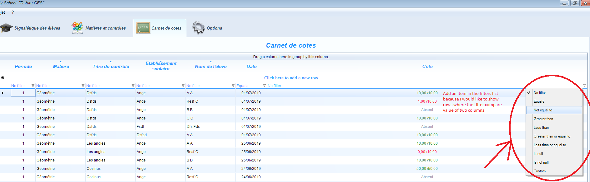 My goal is to have a new custom filter that allows to display rows by comparing the value of 2 columns