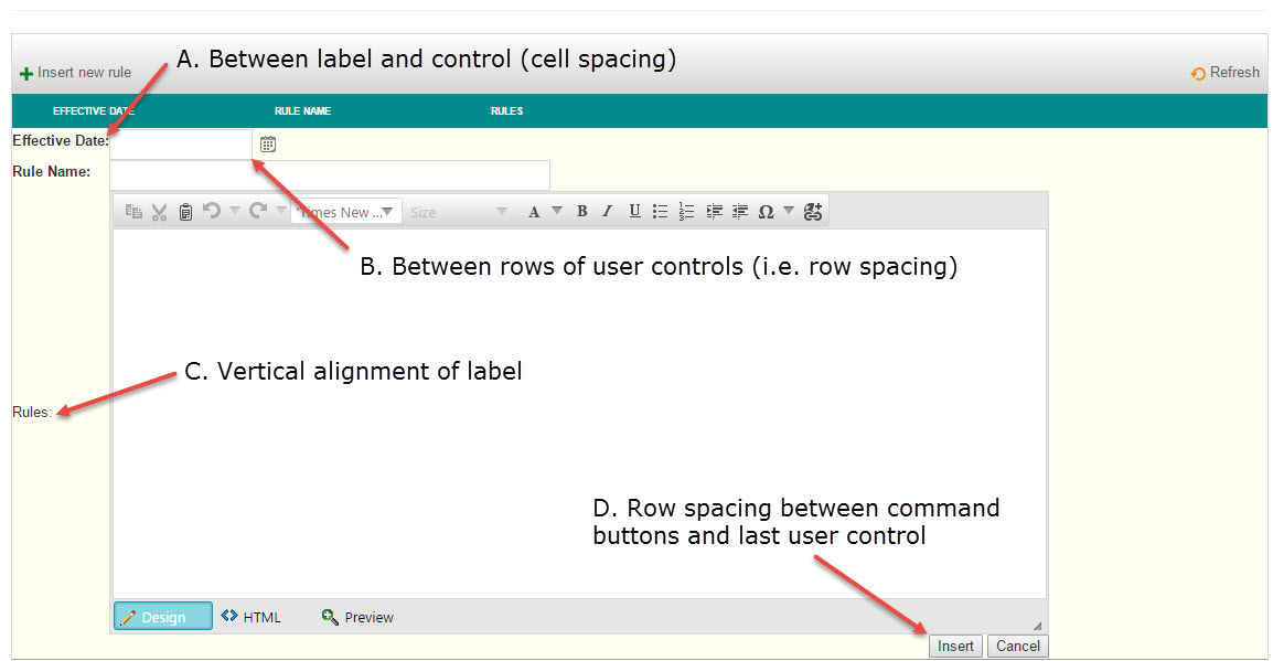 1. How do I set the column/cell spacing between labels and controls (Item A in the file)?