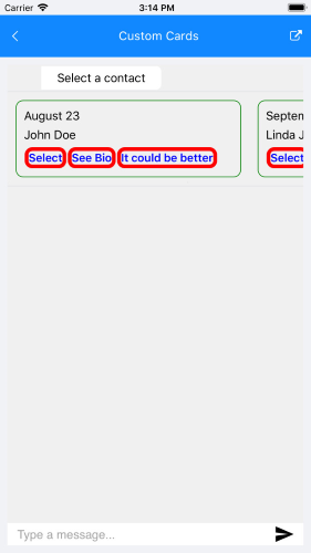 <Style TargetType="telerikConversationalUI:CardActionView"><br> <Setter Property="Template"><br> <Setter.Value><br> <ControlTemplate><br> <telerikPrimitives:RadBorder BorderThickness="5" CornerRadius="10" BorderColor="{Static helpers:Constants.MainBlue}"><br> <Label Text="{TemplateBinding Text}" <br> TextColor="{Static helpers:Constants.MainBlue}"<br> FontSize="15"<br> FontAttributes="Bold"<br> HorizontalTextAlignment="Center"<br> telerikCommon:LabelExtensions.TapCommand="{TemplateBinding Command}" /><br> </telerikPrimitives:RadBorder><br> </ControlTemplate><br> </Setter.Value><br> </Setter><br> </Style>