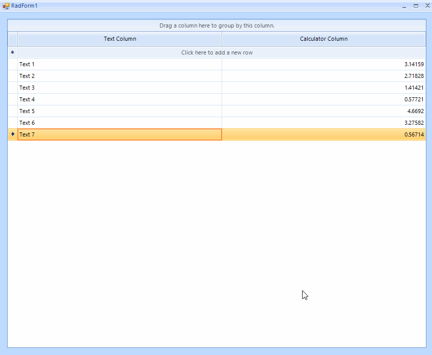 public RadForm1(){ InitializeComponent(); GridViewCalculatorColumn column = new GridViewCalculatorColumn("Calculator column"); this.radGridView1.Columns.Add(column); this.radGridView1.AutoSizeColumnsMode = GridViewAutoSizeColumnsMode.Fill; this.radGridView1.Rows.Add(3.14159); this.radGridView1.Rows.Add(2.71828); this.radGridView1.Rows.Add(1.41421); this.radGridView1.Rows.Add(0.57721); this.radGridView1.Rows.Add(4.66920); this.radGridView1.Rows.Add(3.27582); this.radGridView1.Rows.Add(0.56714); this.radGridView1.CellEditorInitialized += radGridView1_CellEditorInitialized;}private void radGridView1_CellEditorInitialized(object sender, GridViewCellEventArgs e){ RadCalculatorEditor calculator = e.ActiveEditor as RadCalculatorEditor; if (calculator != null) { RadCalculatorEditorElement calcElement = calculator.EditorElement as RadCalculatorEditorElement; calcElement.CalculatorContentElement.ButtonMplus.Visibility = Telerik.WinControls.ElementVisibility.Collapsed; calcElement.CalculatorContentElement.ButtonMminus.Visibility = Telerik.WinControls.ElementVisibility.Collapsed; calcElement.CalculatorContentElement.ButtonMS.Visibility = Telerik.WinControls.ElementVisibility.Collapsed; calcElement.CalculatorContentElement.ButtonMR.Visibility = Telerik.WinControls.ElementVisibility.Collapsed; calcElement.CalculatorContentElement.ButtonMC.Visibility = Telerik.WinControls.ElementVisibility.Collapsed; calcElement.CalculatorContentElement.ButtonSqrt.Visibility = Telerik.WinControls.ElementVisibility.Collapsed; RadCalculatorDigitButtonElement myButton = new RadCalculatorDigitButtonElement("ABC"); myButton.Click += myButton_Click; calcElement.CalculatorContentElement.GridLayout.Children.Insert(0, myButton); }}int defaultValue = 5;private void myButton_Click(object sender, EventArgs e){ RadCalculatorDigitButtonElement myButton = sender as RadCalculatorDigitButtonElement; ((RadCalculatorContentElement)myButton.Parent.Parent).CalculatorElement.Value = defaultValue;}Note that this is just a approach and it may not cover all possible cases. Feel free to modify it in a way which suits your requirement best.