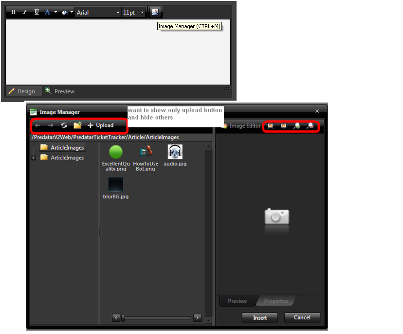 i am using radeditor which has toolbar icon of image manager to insert image, when i click on it that 'image manager' window open which has futher toolbar buttons. i want to hide some buttons from that toolbar. What should i do???