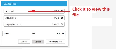 void OnItemClicked(object sender, MouseButtonEventArgs e){ RadUploadItem item = (e.OriginalSource as FrameworkElement).ParentOfType<RadUploadItem>(); if (item != null) { foreach (RadUploadSelectedFile file in xRadUpload.CurrentSession.SelectedFiles) { if (file.Name == item.FileName) { //implement your logic that opens the files } } }}2. After upload files, can we remove one or more files in the list - You can edit the default Metro style of the RadUploadItems to make sure that the Close button element is always visible. By default its Visibility property is controlled through one private property so you can just edit its definition to remove the Visibility property at all.
