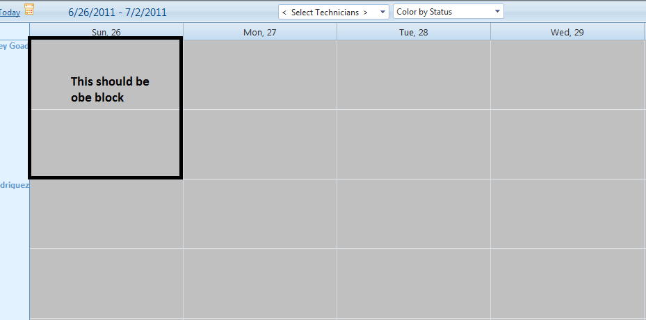 <WeekView UserSelectable="True" GroupBy ="TechName" GroupingDirection="Vertical" ShowHoursColumn="false" />