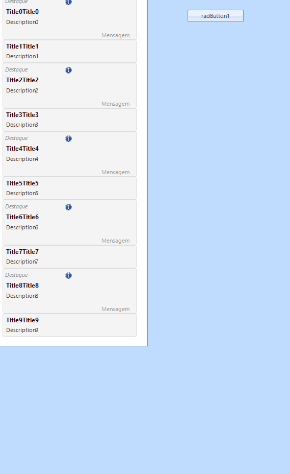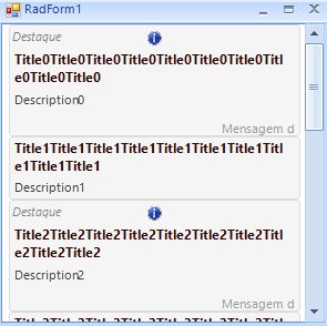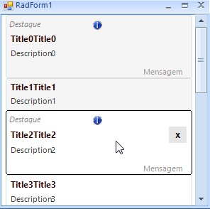 class MensagensCustomListView : SimpleListViewVisualItem { LightVisualElement tituloElement; LightVisualElement descricaoElement; LightVisualElement textoImageDestaqueElement; LightVisualElement nossoObterElement; LightVisualElement fecharElement; StackLayoutPanel stackLayout; private void Elemento_MouseLeave(object sender, EventArgs e) { BackColor = Color.Transparent; BorderColor = Color.FromArgb(221, 221, 221); fecharElement.Visibility = ElementVisibility.Hidden; } private void Elemento_MouseEnter(object sender, EventArgs e) { BackColor = Color.White; BorderColor = Color.Black; this.BorderGradientStyle = GradientStyles.Solid; var bound = Data.DataBoundItem as notificacao_model; if (bound.pode_fechar_notificacao) fecharElement.Visibility = ElementVisibility.Visible; else fecharElement.Visibility = ElementVisibility.Hidden; } protected override void CreateChildElements() { base.CreateChildElements(); stackLayout = new StackLayoutPanel { Orientation = System.Windows.Forms.Orientation.Vertical, ShouldHandleMouseInput = false, NotifyParentOnMouseInput = true, }; textoImageDestaqueElement = new LightVisualElement { Font = new Font("Segoe UI", 8, FontStyle.Italic, GraphicsUnit.Point), ForeColor = Color.Gray, TextAlignment = ContentAlignment.MiddleLeft, Margin = new System.Windows.Forms.Padding(1, 3, 0, 0), Text = "Destaque", ShouldHandleMouseInput = false, NotifyParentOnMouseInput = true, Visibility = ElementVisibility.Collapsed, }; stackLayout.Children.Add(textoImageDestaqueElement); var stackLayoutHorizontal = new StackLayoutPanel { ShouldHandleMouseInput = false, NotifyParentOnMouseInput = true, Orientation = Orientation.Horizontal }; tituloElement = new LightVisualElement { TextAlignment = System.Drawing.ContentAlignment.MiddleLeft, TextWrap = true, Margin = new System.Windows.Forms.Padding(3, 1, 3, 1), Font = new System.Drawing.Font("Segoe UI", 9, System.Drawing.FontStyle.Bold, System.Drawing.GraphicsUnit.Point), ForeColor = System.Drawing.Color.FromArgb(51, 3, 0), StretchHorizontally = true, ShouldHandleMouseInput = false, NotifyParentOnMouseInput = true, }; stackLayoutHorizontal.Children.Add(tituloElement); fecharElement = new LightVisualElement { Font = new System.Drawing.Font("Arial", 10, System.Drawing.FontStyle.Bold, System.Drawing.GraphicsUnit.Point), ForeColor = System.Drawing.Color.Black, Text = "x", StretchHorizontally = false, DisableHTMLRendering = false, BackColor = Color.FromArgb(230, 230, 230), EnableHighlight = true, HighlightColor = Color.FromArgb(240, 240, 240), Padding = new Padding(5, 2, 5, 2), DrawFill = true, ToolTipText = "Fechar Mensagem", NumberOfColors = 1, Visibility = ElementVisibility.Collapsed, }; fecharElement.MouseEnter += Elemento_MouseEnter; fecharElement.MouseLeave += Elemento_MouseLeave; fecharElement.Click += FecharElement_Click; stackLayoutHorizontal.Children.Add(fecharElement); stackLayout.Children.Add(stackLayoutHorizontal); descricaoElement = new LightVisualElement { TextAlignment = System.Drawing.ContentAlignment.MiddleLeft, Margin = new System.Windows.Forms.Padding(3, 1, 3, 1), Font = new System.Drawing.Font("Segoe UI", 8, System.Drawing.FontStyle.Regular, System.Drawing.GraphicsUnit.Point), ForeColor = System.Drawing.Color.FromArgb(60, 60, 60), ShouldHandleMouseInput = false, NotifyParentOnMouseInput = true, }; stackLayout.Children.Add(descricaoElement); nossoObterElement = new LightVisualElement { Margin = new System.Windows.Forms.Padding(190, 5, 3, 0), Font = new System.Drawing.Font("Segoe UI", 8, FontStyle.Regular, System.Drawing.GraphicsUnit.Point), ForeColor = Color.FromArgb(153, 153, 153), Text = "Mensagem da Obter", ShouldHandleMouseInput = false, NotifyParentOnMouseInput = true, }; stackLayout.Children.Add(nossoObterElement); Children.Add(stackLayout); Margin = new Padding(6, 0, 0, 0); Padding = new System.Windows.Forms.Padding(1); BackColor = Color.FromArgb(245, 245, 245); BorderColor = Color.FromArgb(221, 221, 221); BorderGradientStyle = GradientStyles.Solid; DrawBorder = true; DrawFill = true; Shape = new RoundRectShape { BottomLeftRounded = true, BottomRightRounded = true, TopLeftRounded = true, TopRightRounded = true, Radius = 3 }; this.MouseEnter += Elemento_MouseEnter; this.MouseLeave += Elemento_MouseLeave; //SetMouseEnterLeave(stackLayout, stackLayoutHorizontal, textoImageDestaqueElement, tituloElement, descricaoElement, nossoObterElement, fecharElement, this); } private void FecharElement_Click(object sender, EventArgs e) { var bound = Data.DataBoundItem as notificacao_model; Data.ListView.Items.Remove(Data); this.Visibility = ElementVisibility.Collapsed; if (bound != null) { bound.notificacao_fechada = true; bound.OnFechar(); } } protected override void SynchronizeProperties() { var bound = Data.DataBoundItem as notificacao_model; if (bound != null) { tituloElement.Text = bound.titulo; if (bound.descricao.IsNotNullOrEmpty()) { descricaoElement.Visibility = ElementVisibility.Visible; descricaoElement.Text = bound.descricao; } else descricaoElement.Visibility = ElementVisibility.Collapsed; if (bound.destaque == true) { textoImageDestaqueElement.DrawImage = true; textoImageDestaqueElement.Visibility = ElementVisibility.Visible; if (textoImageDestaqueElement.Image == null) textoImageDestaqueElement.Image = new Bitmap(Properties.Resources.favicon.ToBitmap(), new Size(16, 16)); } else textoImageDestaqueElement.Visibility = ElementVisibility.Collapsed; if (bound.mensagem_da_obter) nossoObterElement.Visibility = ElementVisibility.Visible; else nossoObterElement.Visibility = ElementVisibility.Collapsed; } } }