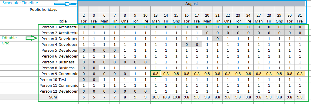 I need to have the flexibility of the scheduler timeline over an editable grid to achieve similar functionality to the attached image.