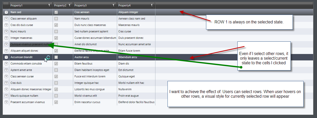 Can you help me again? I encountered this problem with the current/selected state for row styles. In my rad grid, I am using a row style and alternating row style. Both have same visual styles when a user selects the entire row. However, Ive noticed that the select state is only shown in the top most row of the grid and does not apply with the other rows. I'm confused on how will I resolve this problem.