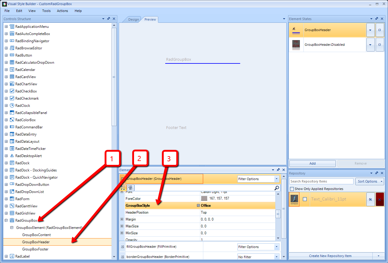 I'm using Visual Studio Builder to customize the GroupBox control.