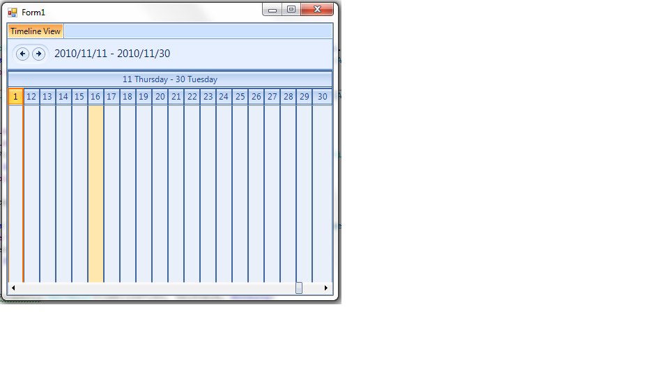 Private Sub Form1_Load(ByVal sender As System.Object, ByVal e As System.EventArgs) Handles MyBase.Load Me.RadScheduler1.ActiveViewType = SchedulerViewType.Timeline Me.RadScheduler1.SchedulerElement.BeginElementUpdate() Dim timelineView As SchedulerTimelineView = Me.RadScheduler1.GetTimelineView() Dim dayScale As New DaytimeScale() dayScale.DisplayedCellsCount = 20 Dim currentScaleProperty As PropertyInfo For Each p As PropertyInfo In GetType(Telerik.WinControls.UI.SchedulerTimelineView).GetProperties() If p.Name = "CurrentScale" Then currentScaleProperty = p Exit For End If Next currentScaleProperty.SetValue(timelineView, dayScale, Nothing) Me.RadScheduler1.SchedulerElement.EndElementUpdate() Me.RadSchedulerNavigator1.MonthViewButtonVisible = False Me.RadSchedulerNavigator1.WeekViewButtonVisible = False Me.RadSchedulerNavigator1.DayViewButtonVisible = False Me.RadSchedulerNavigator1.AssociatedScheduler = Me.RadScheduler1 timelineView.StartDate = DateTime.Now.AddDays(1) timelineView.StartDate = DateTime.Now End SubHope this helps, but if you have any more questions, just let me know.