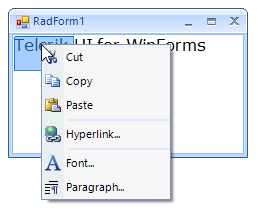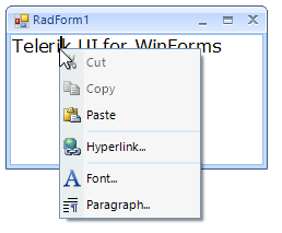 RadRichTextEditor uses a ContextMenuContentBuilder for creating the menu that is shown when you right click on the text.