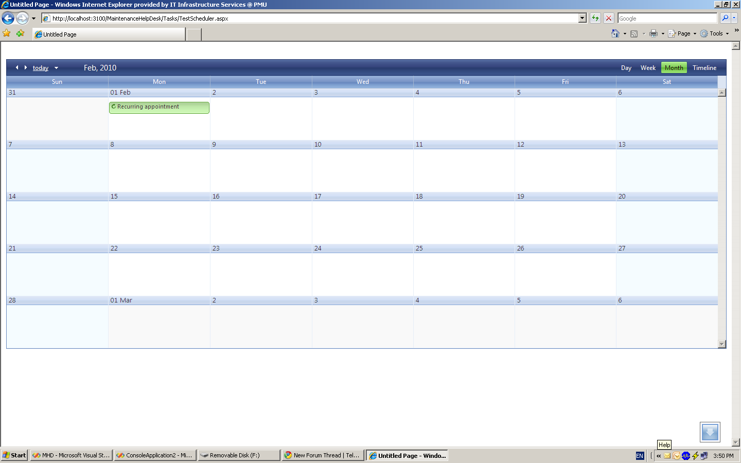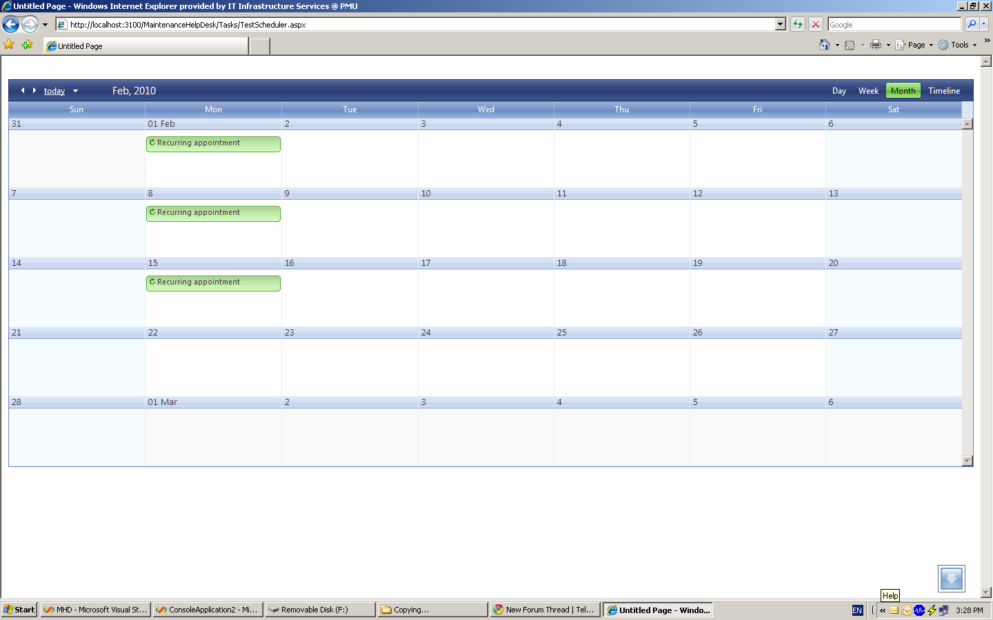 although i partially manage to complete the first scenario to recur appointment every monday but it showing only 3 recurrence in month instead of 4 times during the dates between 2/1/1010 and 3/1/2010.  this is my code which i am using to create the appointment can you tell me is i am doing something wrong...