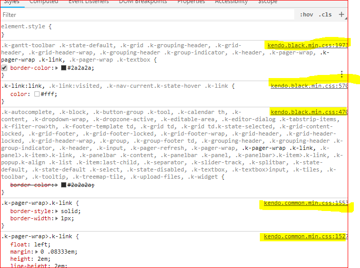 1) As you can see from the screen shot the arrows that navigate are not showing in a light enough color, I want them to show as white. And on a grid if you have it set to let's say a pager size of 50 with more than 50 the numbers to not show in a light enough color. How do you override the .css here?