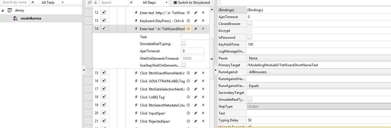 I have a problem about binding a source to input a textbox. In my company's online tool, you can create statistical models with variety of way. I need to test every model. I listed all steps to create a model. Firstly, in order to create a model, you need to give a name. All steps working well. However, i can not create automated creating of models. I can not bind model name textbox with a datasource. I attached the images that show my problem. I need to add a source to TxtWizardShortName property a datasource to take names. I added also data source i created. Please help me. Thank you