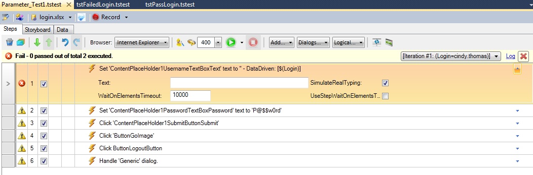 I am testing a login process using a data binded Excel spreadsheet with an array of usernames. I have attached my data source and binded it. I have also set the data driven editor to $(column name) for the test step.